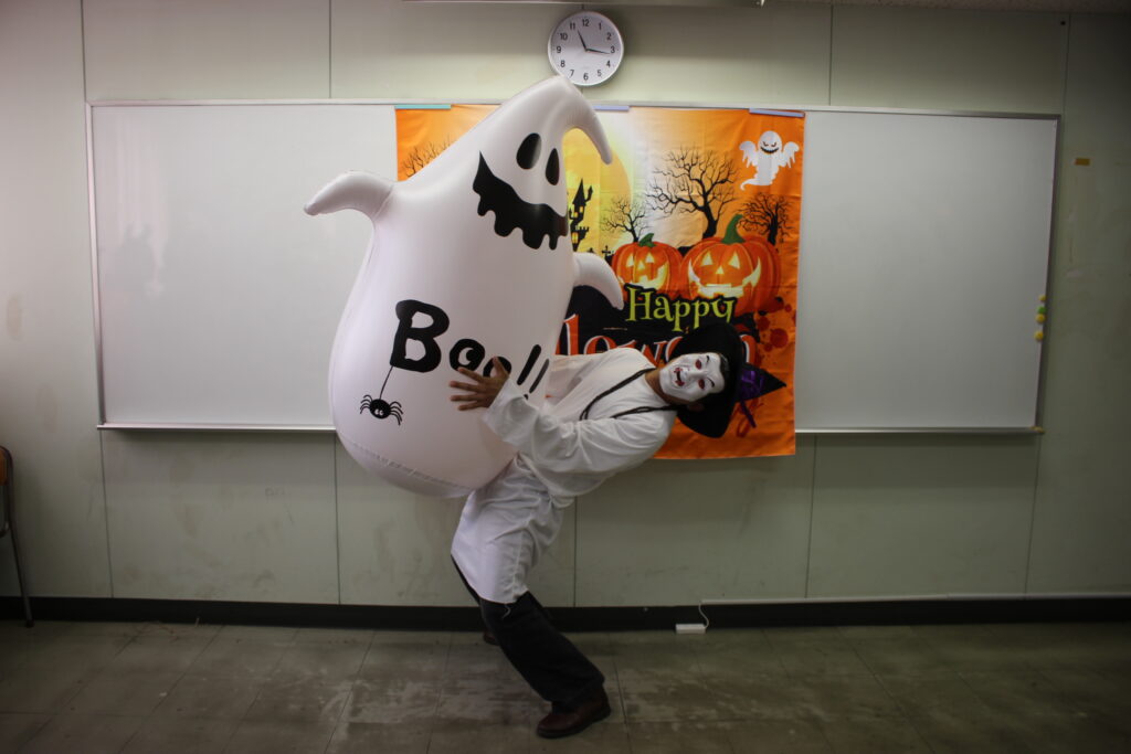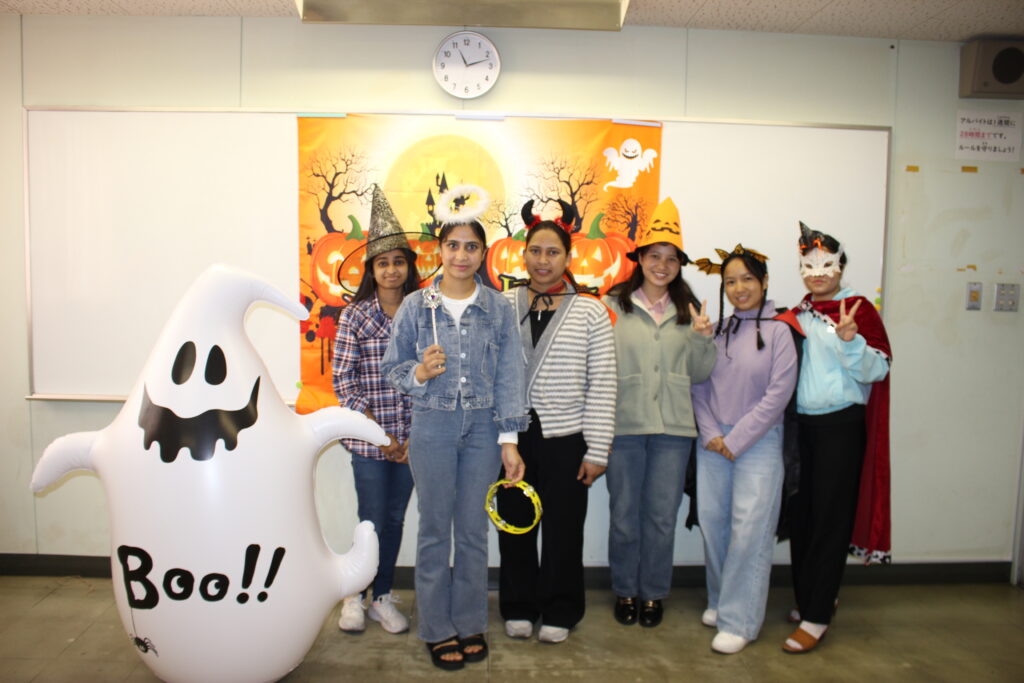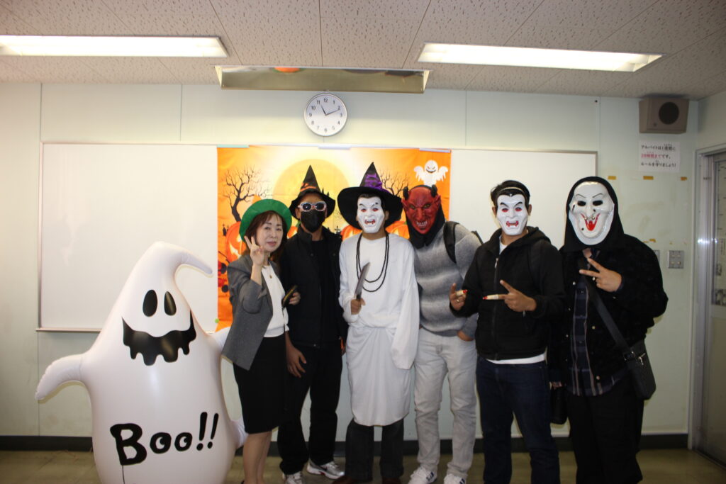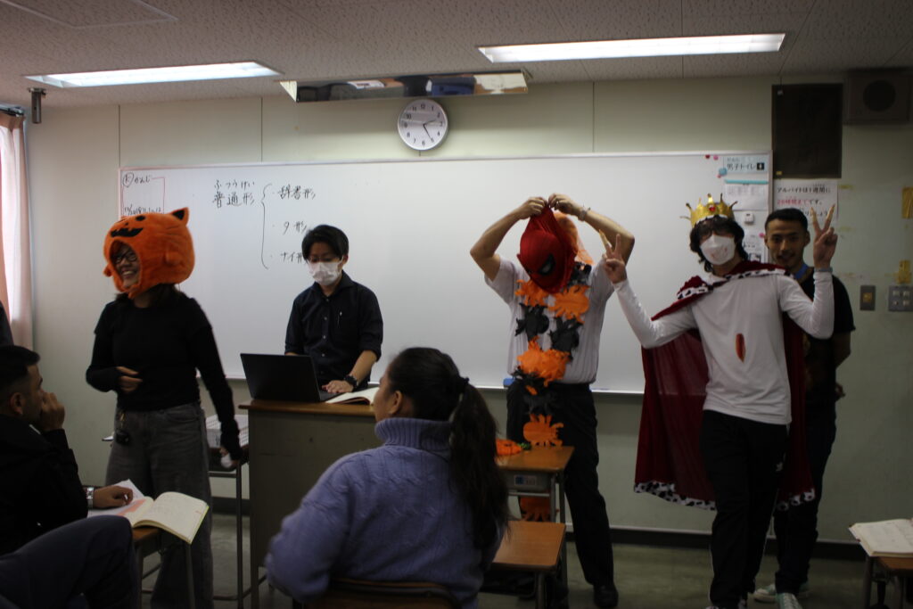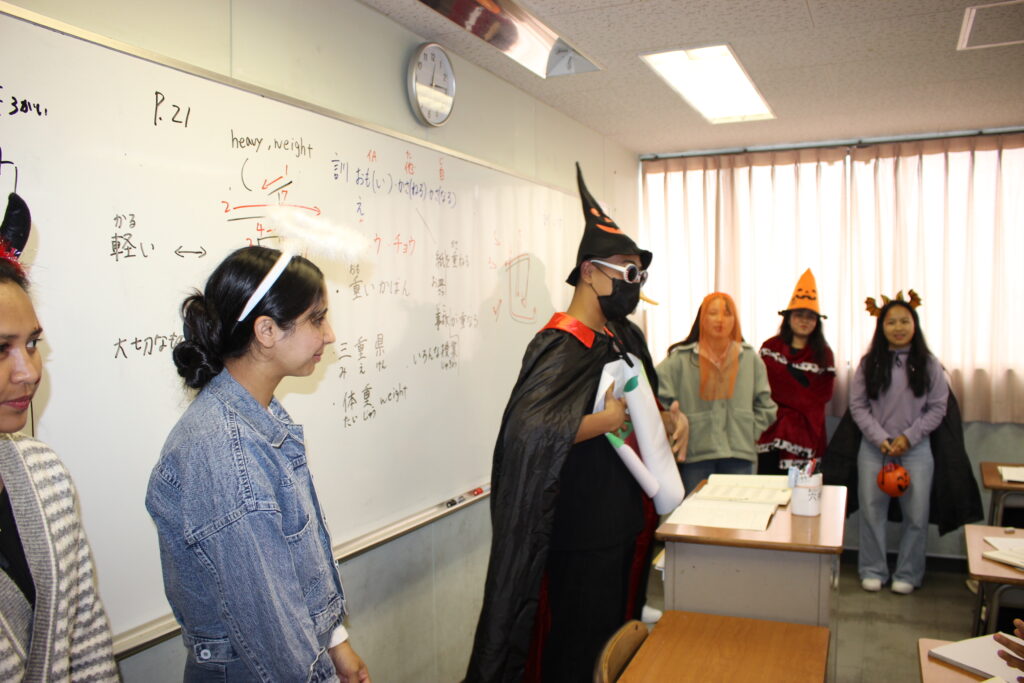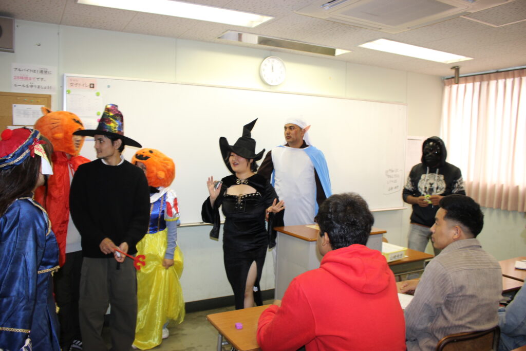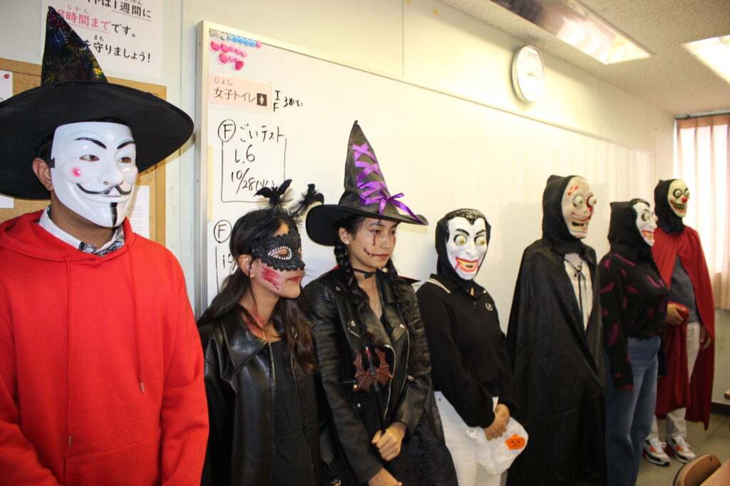 自分たちで考えた仮装をし、各クラスへ「ハッピーハロウィン!」と登場すると日本語学校の学生たちはとても驚いてくれました。