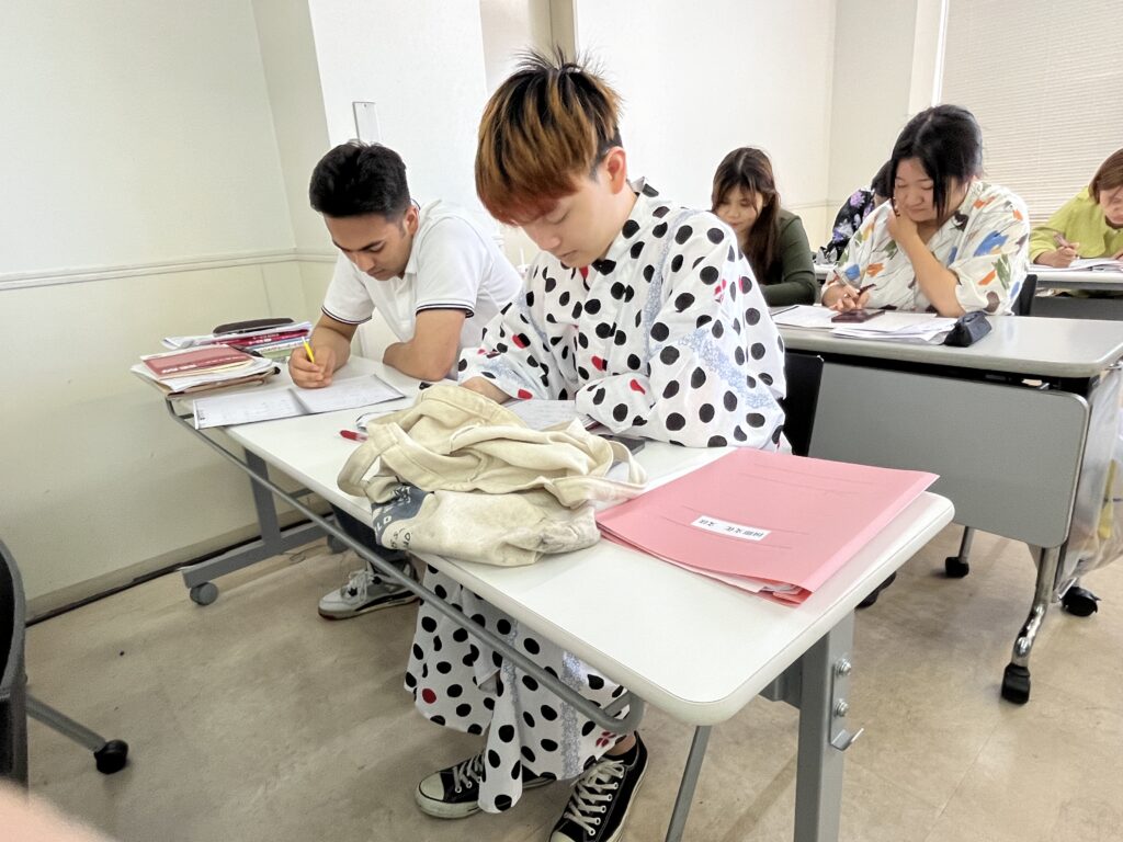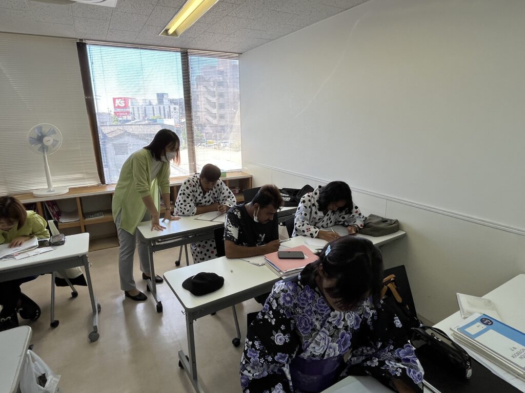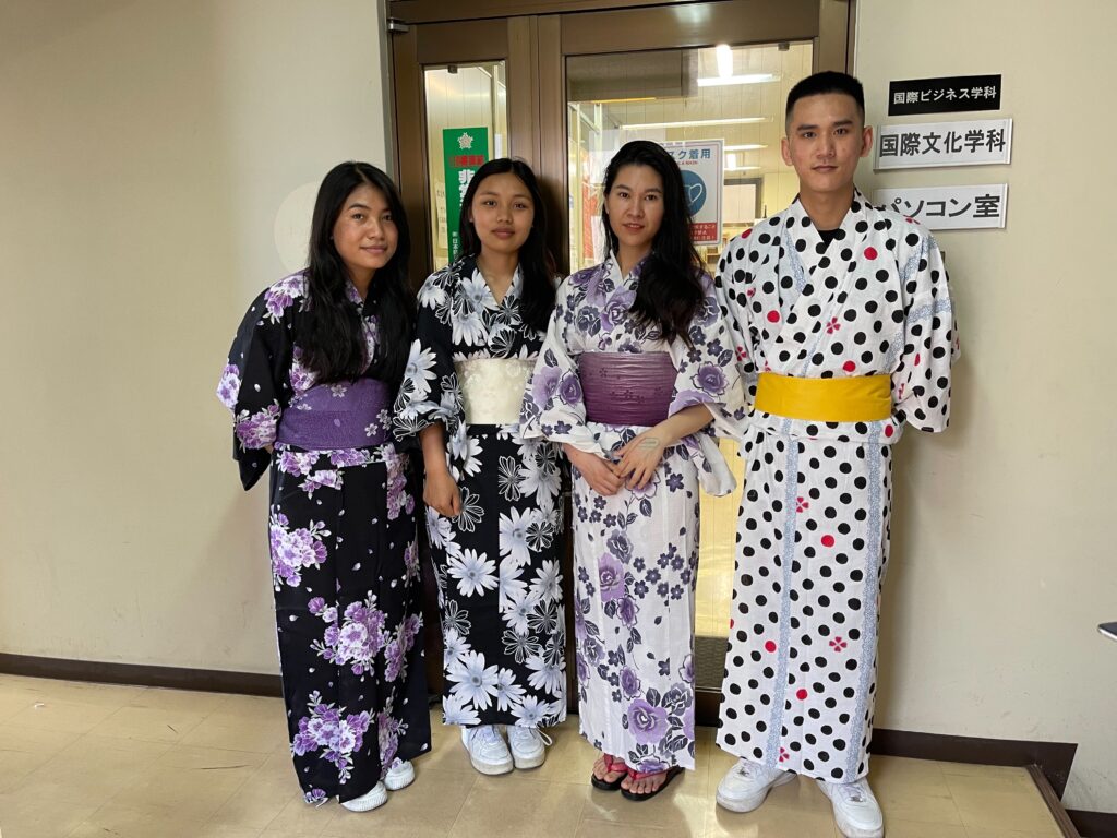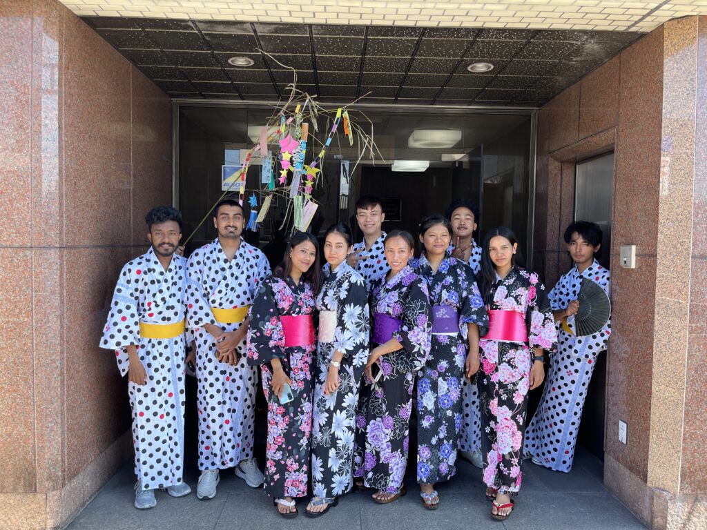 浴衣着付け体験 2024年7月5日 最終更新日時 : 2024年7月23日 kyobun_gaigo@kg-edu.jp 7月5日(金)に少し早いですが、七夕に合わせて希望者を募り、浴衣の着付けを行いました。浴衣を着るのが初めてという学生がほとんどで、たくさんの浴衣と帯から組み合わせを考えていました。笹も用意して飾りや短冊を飾り、日本の七夕を楽しみました。