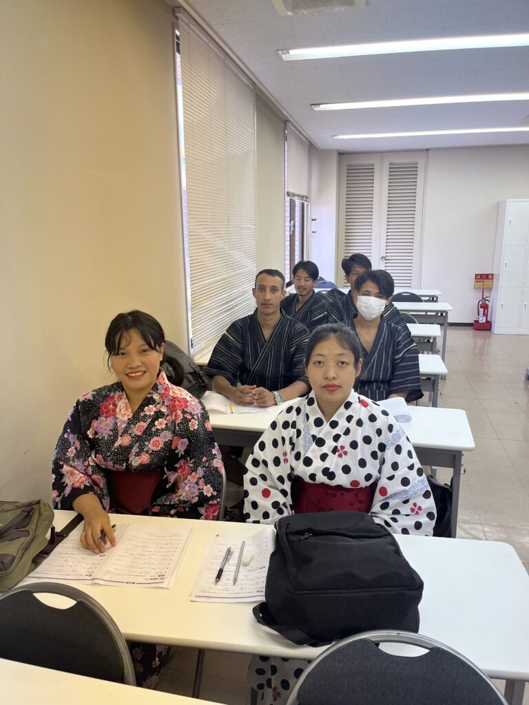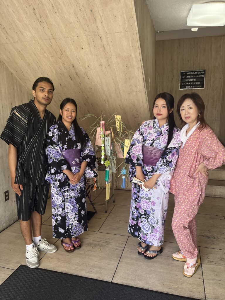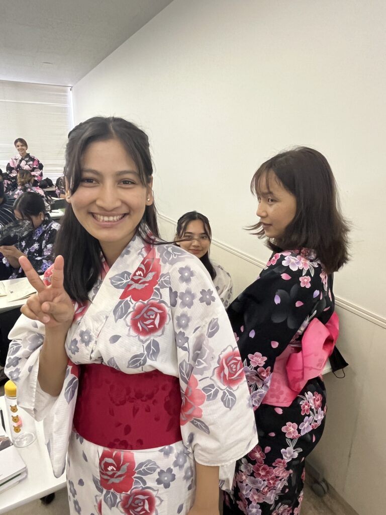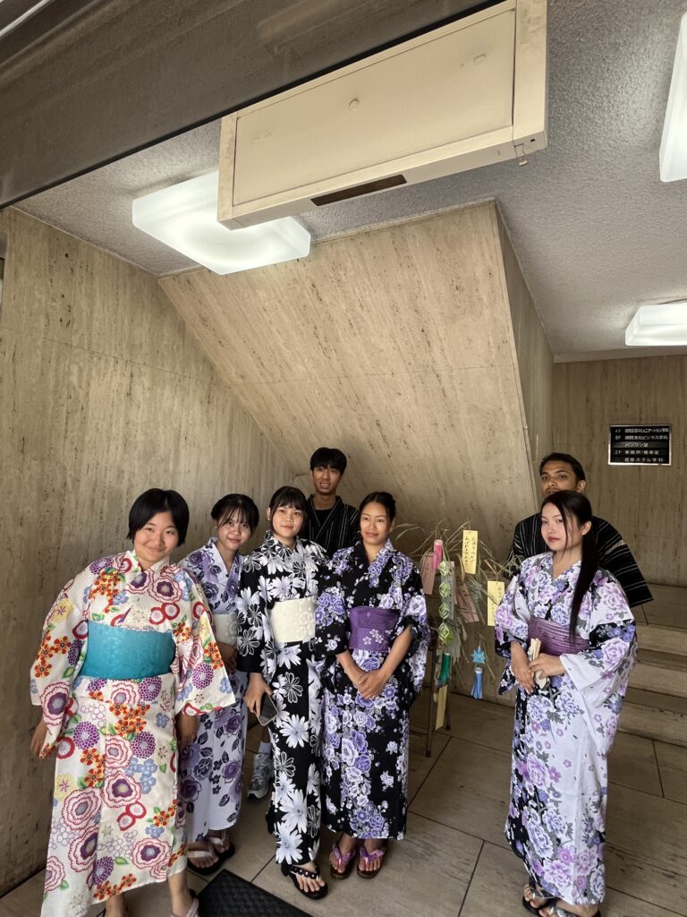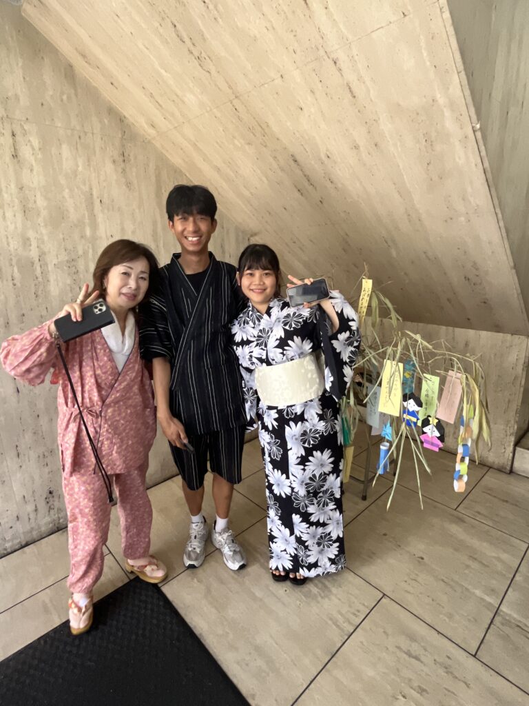 浴衣着付け体験 2025年7月7日 最終更新日時 : 2025年7月30日 kyobun_gaigo@kg-edu.jp 7月7日(月)七夕に合わせて希望者に浴衣の着付け体験を行いました。みなさん沢山ある浴衣と帯の中から好きな組み合わせを真剣に考えていました。用意していた笹に短冊もたくさん飾ってもらいました。