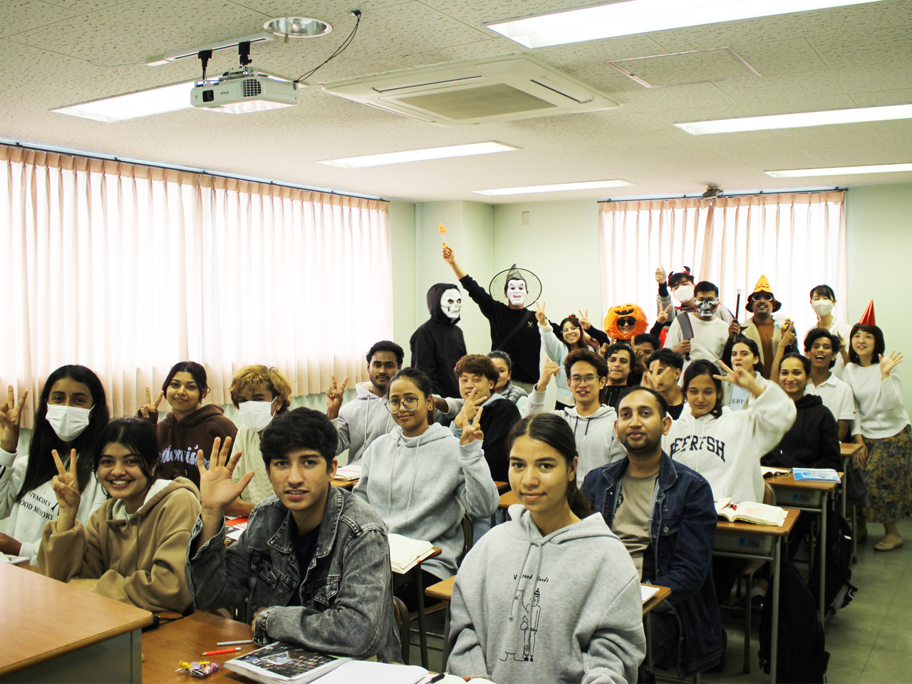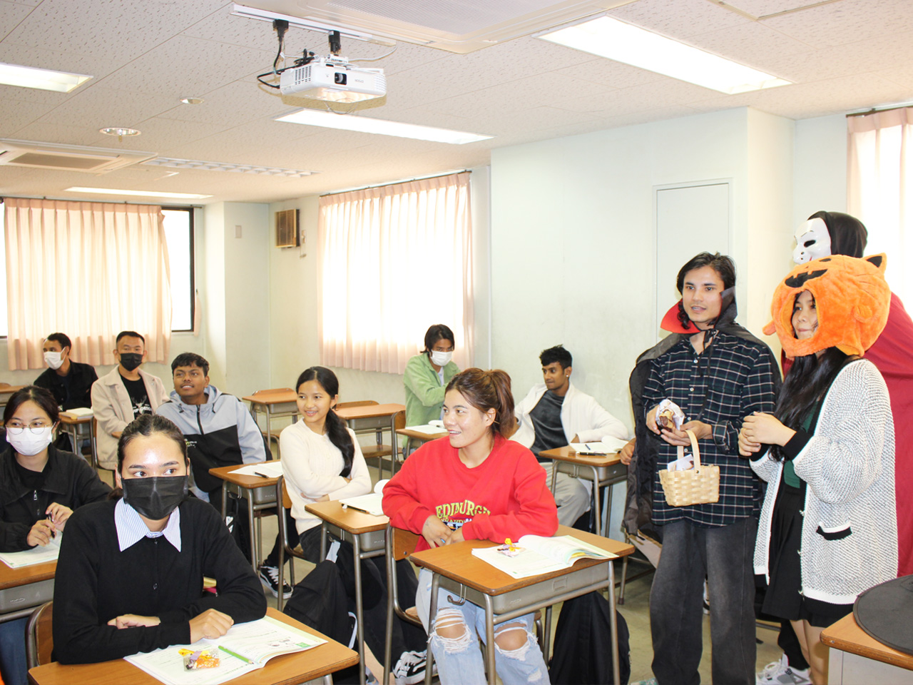 専門学校の学生さんたちが仮装をして、広島アカデミーの学生たち一人一人にお菓子を配ったり、