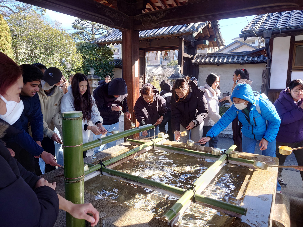 手水場で手を洗ったり、おみくじを買ったり、初めて経験することが多くて楽しいと初めて来た学生たちは楽しんでいました。